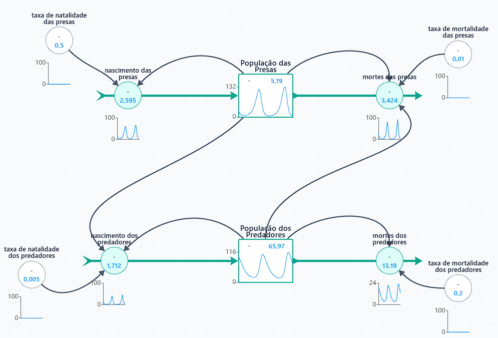 A dinâmica do sistema funciona de forma cíclica: quando a população de ursos aumenta, a pressão sobre as ovelhas aumenta também, levando a uma diminuição da sua população. À medida que as ovelhas diminuem, os ursos perdem a sua principal fonte de alimentação, o que leva, por sua vez, a uma redução da sua população. Com menos ursos, as ovelhas voltam a crescer livremente, iniciando novamente o ciclo.
